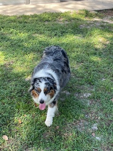 Maggie is spayed. She is crate trained. Walks well on a leash. Know simple commands. She is very calm in the house and enjoys her chewing bones. She will require the right family member, who is knowable on how to care for a special aussie, who is not fond of strangers.